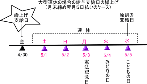 給与の支給日が休日に当たる場合には、通常その直前の営業日に繰り上げて給与を支給しますが、給与を月末締めの翌月5日払いとしていると、年末年始や5月の大型連休のときなどに不都合が生じます。例えば5月1日~5月5日の期間が連休になると、この期間に給与を支給する事はできませんから、4月30日で締めた給与を、直前の営業日である4月30日当日に支給しなければならなくなります。これは事務的に困難です。